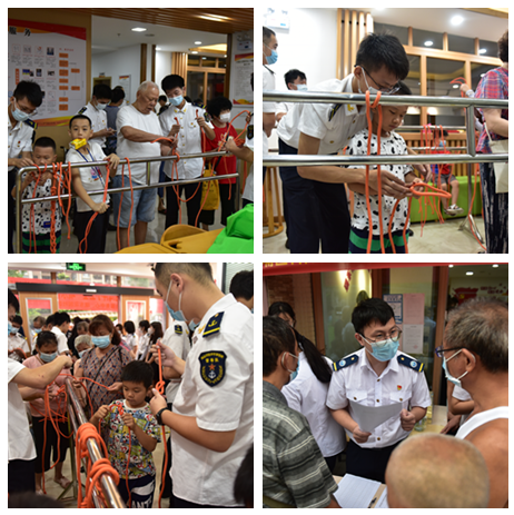 首先,党支部成员在现场进行了“开场秀”——旗语和擒敌拳展演。明快动感的节奏,丰富多变的信号让现场居民对旗语产生浓厚的兴趣。而响亮的口号,英姿飒爽的擒敌拳更为居民赞叹不止。其次,互动环节让社区居民参与其中,学习海洋与救生常识,体验绳结的多种系法,收获颇丰。最后,是本次活动最热门环节——“海洋观普法知识小竞答”。在本次竞答中,社区居民踊跃参与,通过对海洋文化展报和船模展览的学习与支部成员的详细讲解,居民对海洋文化知识有了更深的了解。