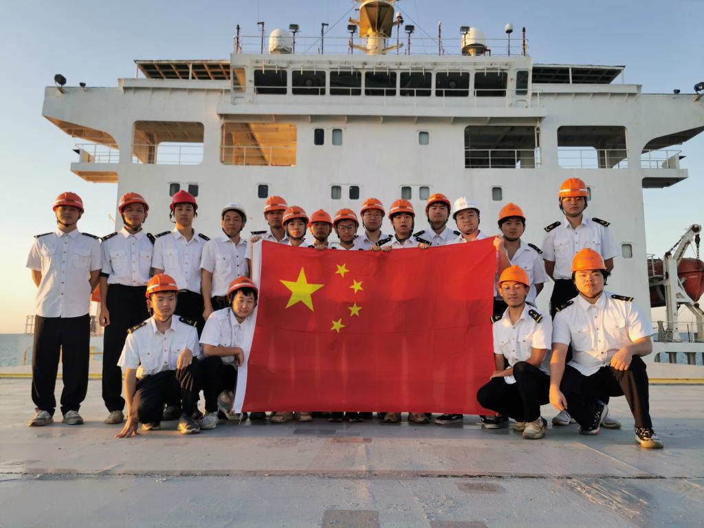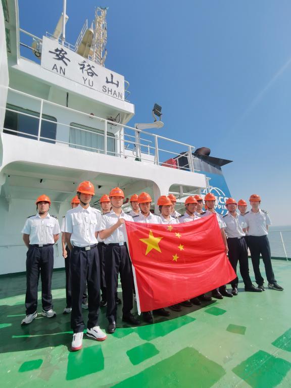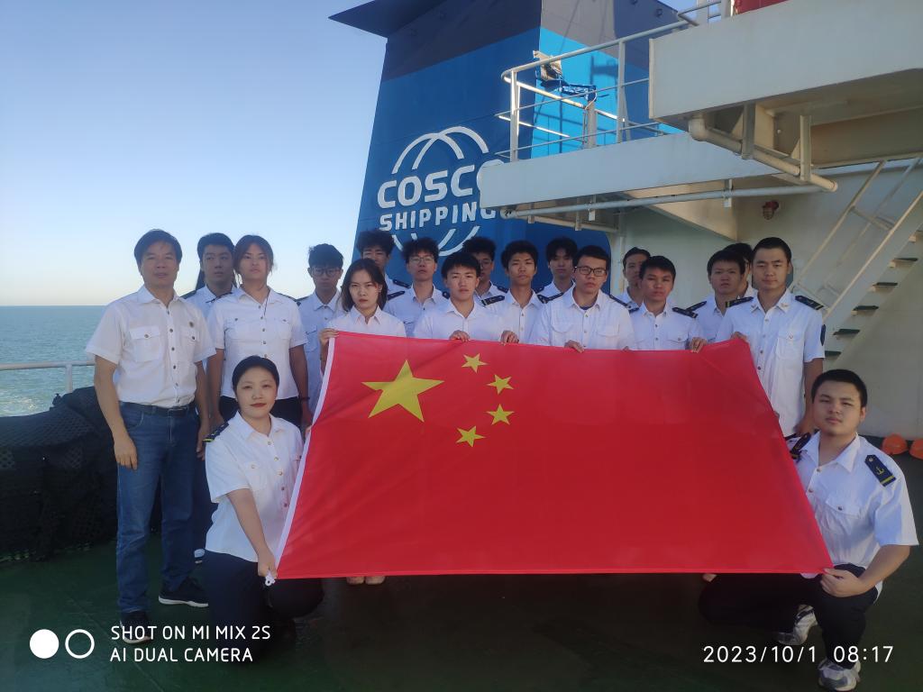 (海运公司供稿)国庆期间,海运公司船舶航行认知实习师生在四艘船上共同庆祝中华人民共和国成立74周年。江剑文、刘春荣两位船长与李顺亮、秦志勇两位老师带领航海技术22级员工在公司与中远海运散货运输有限公司合作建设的“安字号”实习船上举行升旗仪式,祝愿祖国繁荣富强!