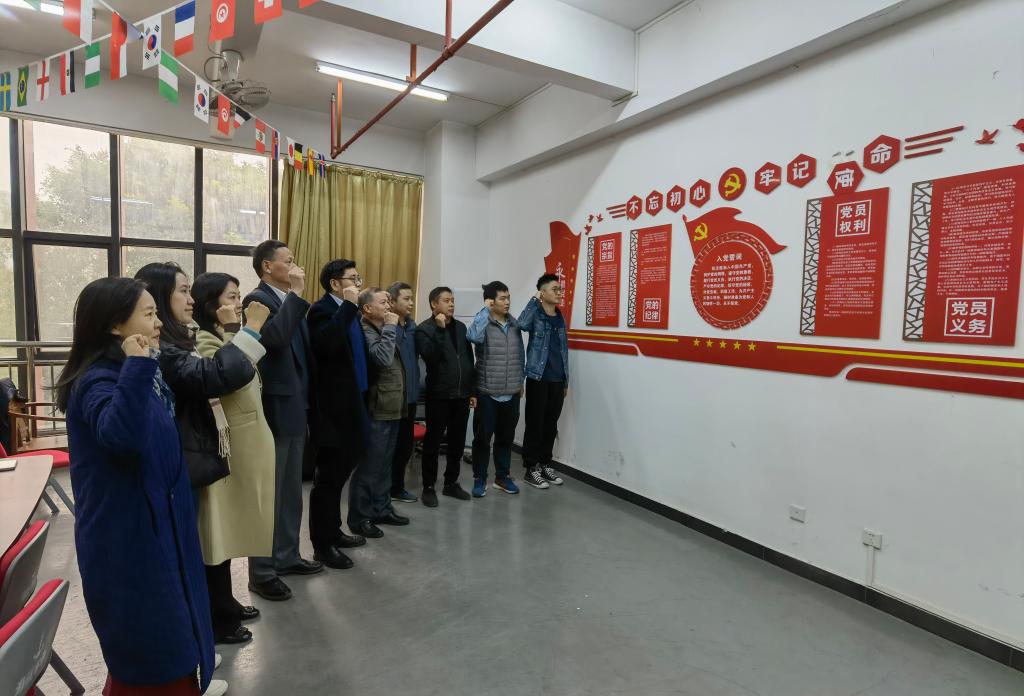 最后,党支部举行了重温入党誓词活动,全体党员同志面向党旗庄严宣誓、重温入党誓词,警示每名党员牢记入党誓词,不忘初心,牢记使命,为教育事业贡献自己的智慧和力量。
