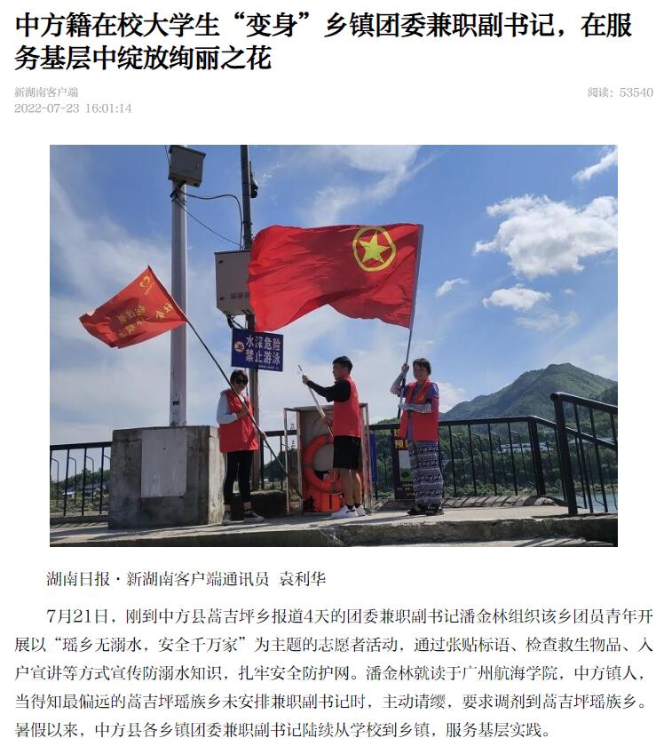 近日,湖南日报新媒体客户端“新湖南客户端”报道公司轮机工程公司轮机192班潘金林同学“变身”湖南省怀化市中方县蒿吉坪瑶族乡兼职团委副书记,积极投身基层治理和乡村振兴的新闻,鼓舞了全院师生。