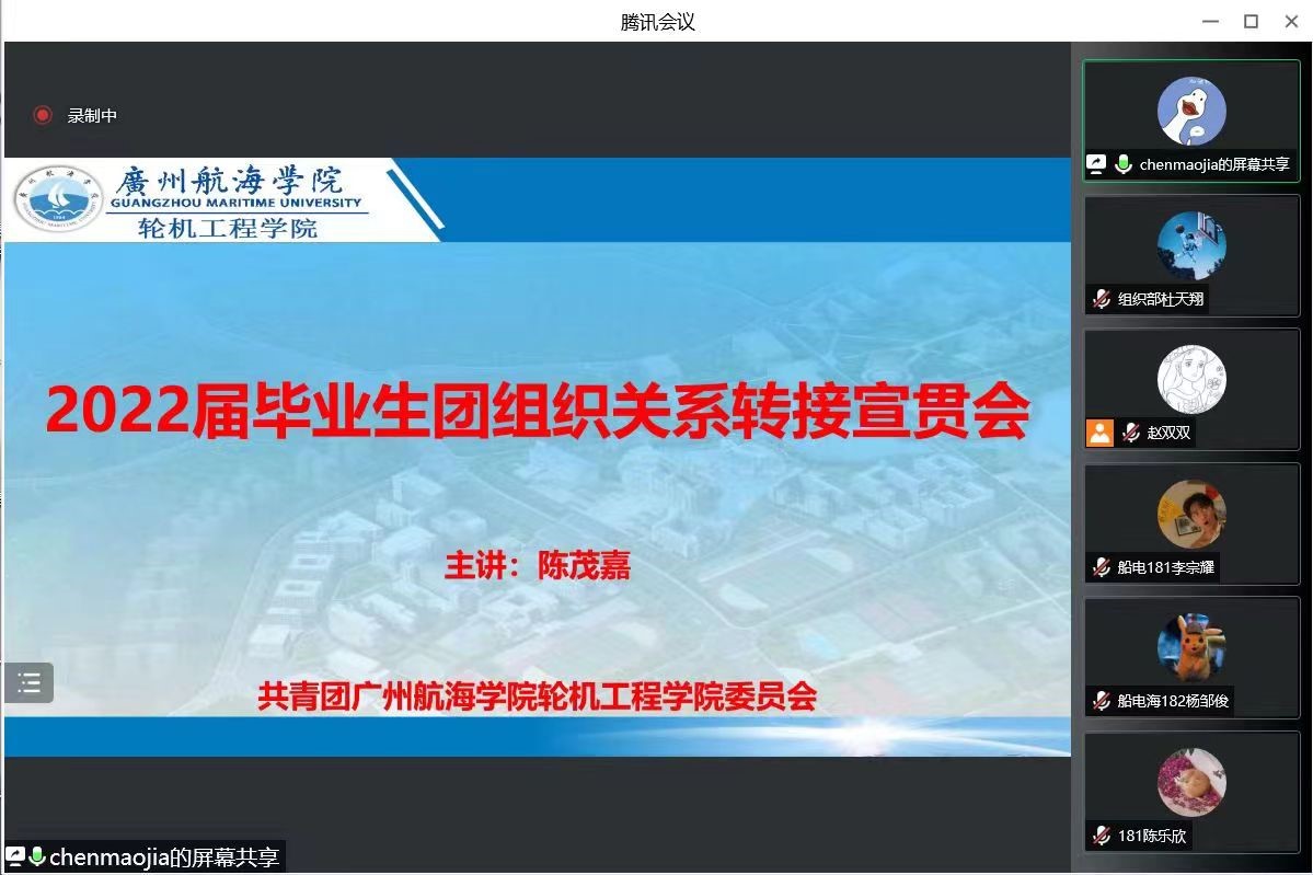 (轮机工程公司供稿)为贯彻落实校团委关于毕业生团组织关系转接工作的相关要求,做好今年共青团学社衔接工作,5月30日晚,轮机工程公司分团委通过腾讯会议召开了2022届毕业生团组织关系转接宣贯会。会议由2018级中队长赵双双老师主持,公司团委书记陈茂嘉老师主讲,全体2018级毕业生团员参加了本次会议。
