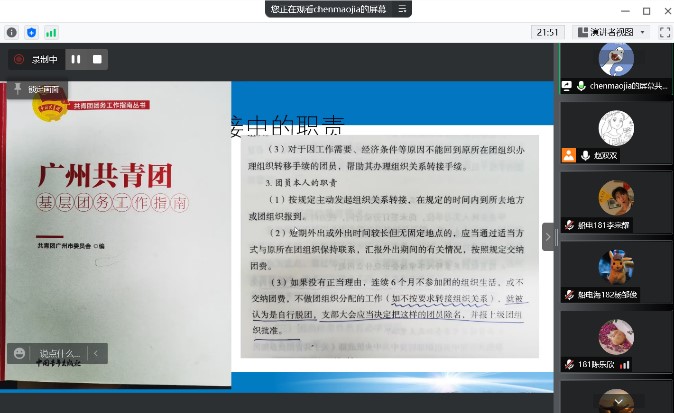 会上,陈茂嘉首先结合《广州市共青团基层团务工作指南》强调了团员组织关系转接中团员的职责以及毕业生团组织关系转接的必要性和重要性。接着,从团员和团支书两个角度详细讲解了团组织关系转接中的具体操作和注意事项。同时,结合流程图,讲解了不同毕业去向转接的不同方向,以免团组织关系转出时发生信息错误导致不能顺利完成转接。会议最后,陈老师针对同学们团组织关系转接过程中容易出现的问题进行答疑。