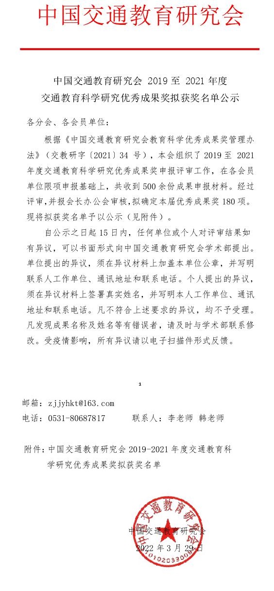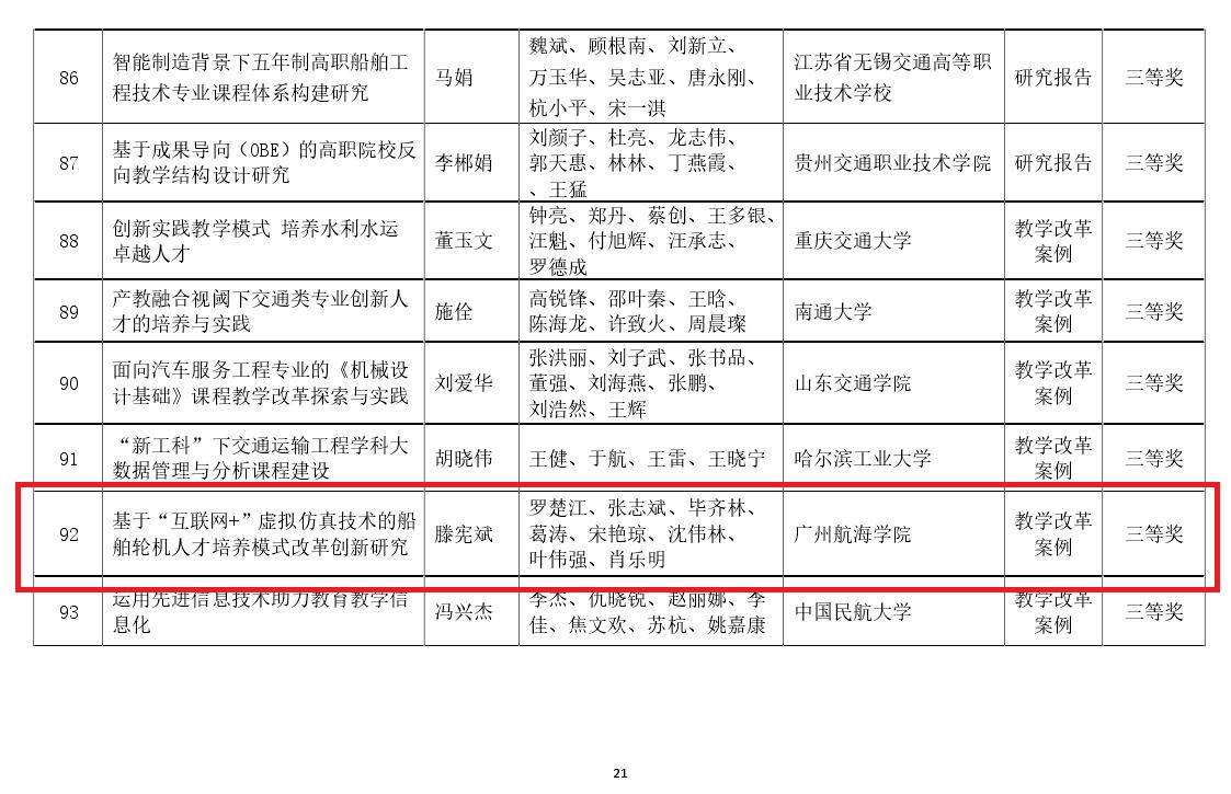 (轮机工程公司供稿)轮机工程公司滕宪斌经理主持的教学改革项目《基于“互联网+”虚拟仿真技术的船舶轮机人才培养模式改革创新研究》获得中国交通教育研究会2019-2021年度交通教育科学研究优秀成果奖三等奖。